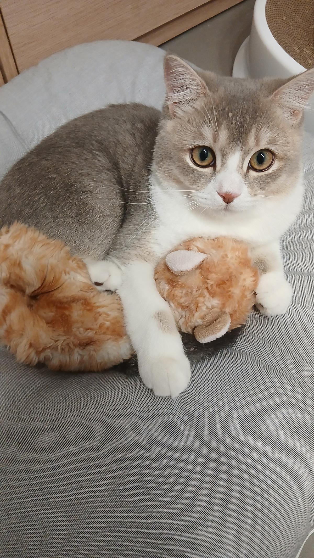 속보입니다. 고냥이가 자기 애착인형을 지켜주고 있네요.