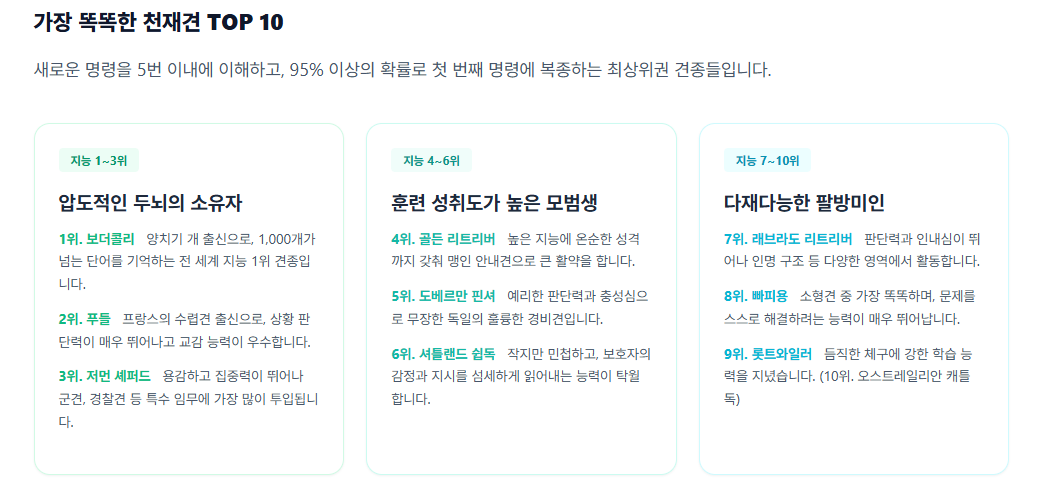 동물 행동학 권위자 스탠리 코렌(Stanley Coren) 박사의 연구를 바탕으로, 가장 똑똑한 견종 10가지와 집에서 간단히 해볼 수 있는 아이큐 테스트 방법을 알기 쉽게 전달해 드립니다.