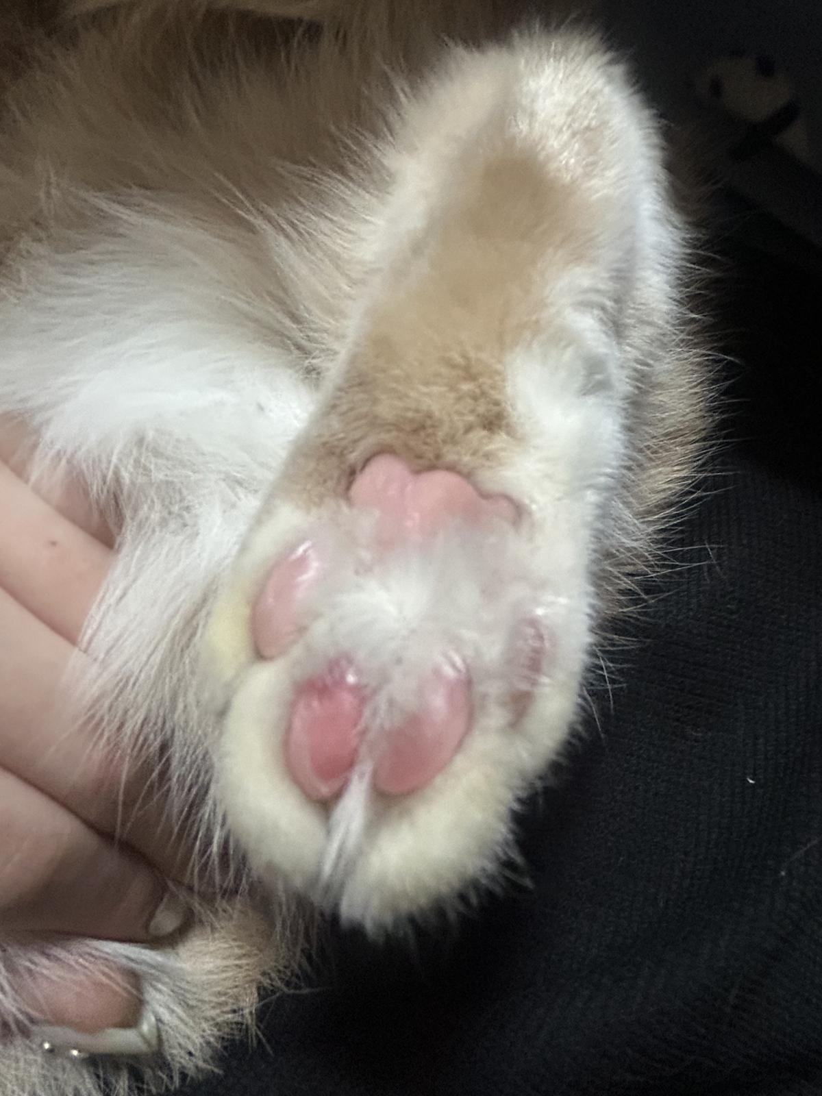 고양이 발이 조금 뜯어져있는걸 발견했는데 평소에 발에 무언가를 발라줬어야했던건지 왜 이렇게 된건지 조언을 구하고 싶습니다! 도움 부탁드립니다 선생님들